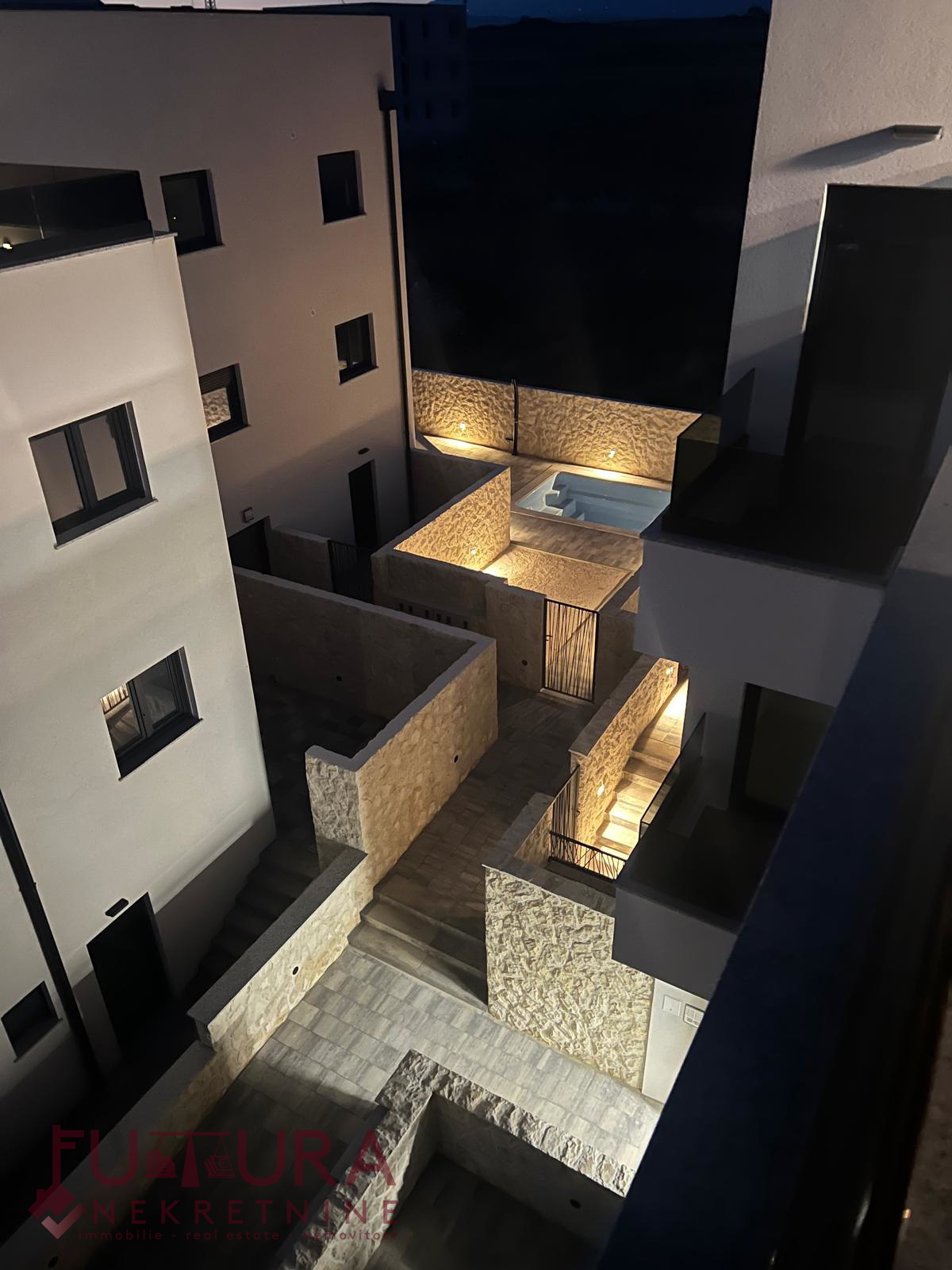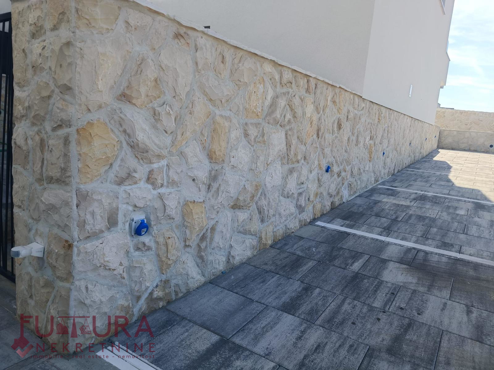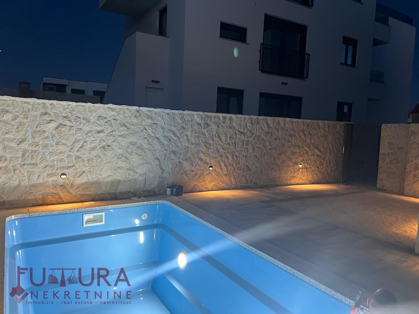 Besitzt einen Parkplatz mit Ladestation für Elektroautos (jede Parksteckdose ist mit dem Stromzähler der jeweiligen Wohnung verbunden), einen Pool mit den Maßen 7 m x 3 m und einen Garten von 39,31 m2.
