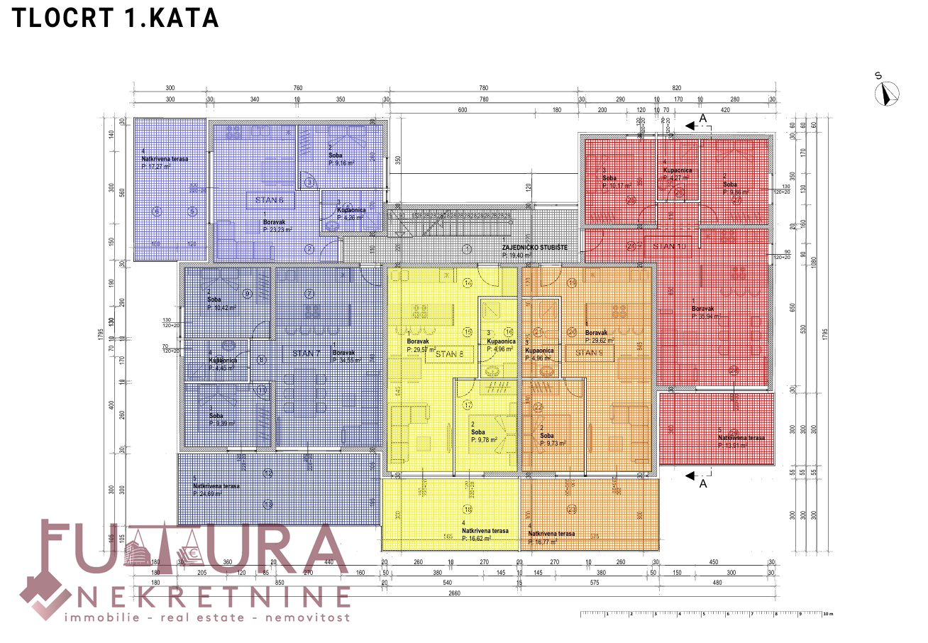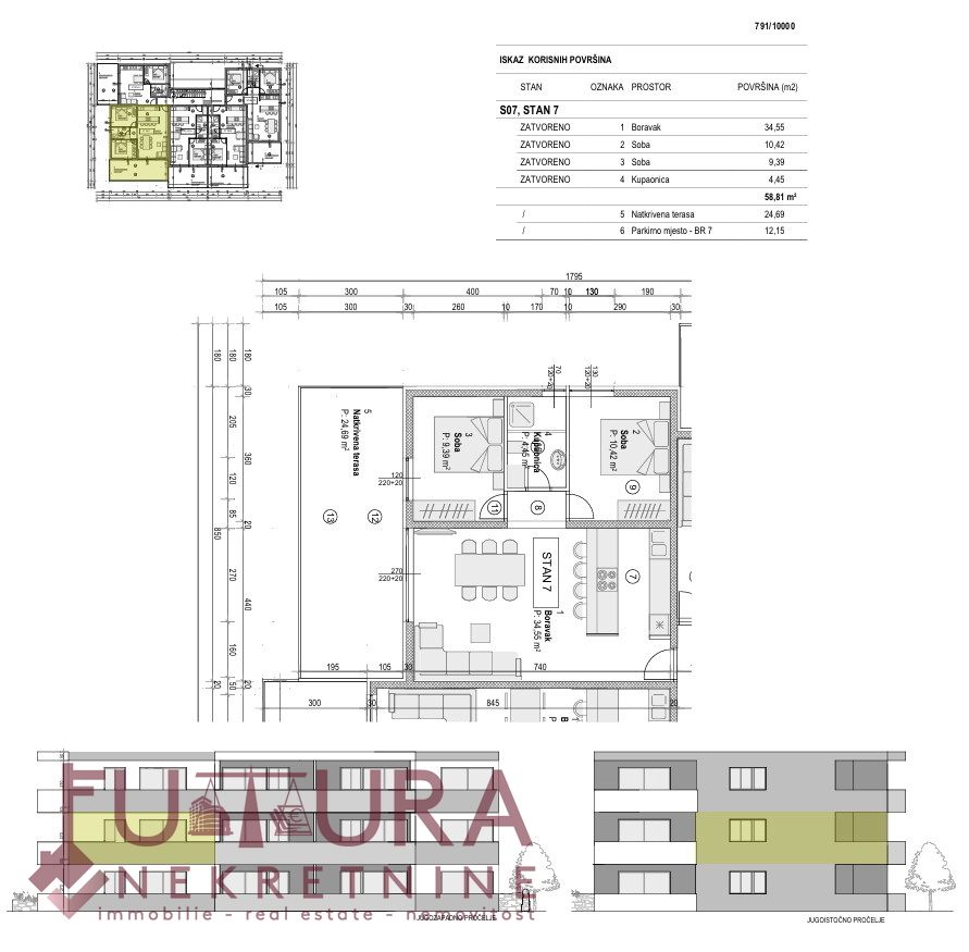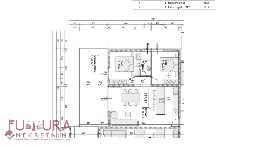 Besteht aus: zwei Schlafzimmern, Wohnzimmer + Küche + Esszimmer, Badezimmer und Terrasse.