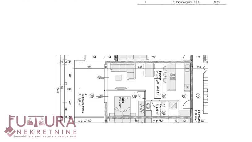 Bestehend aus: einem Schlafzimmer, Wohnzimmer + Küche + Essbereich, Badezimmer und Terrasse.