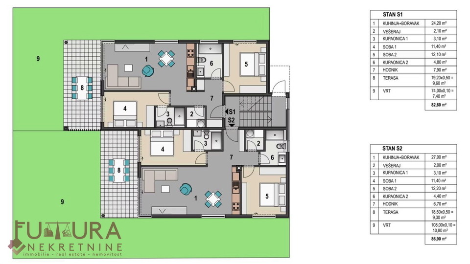 Besteht aus: zwei Schlafzimmern, Wohnzimmer + Küche + Essbereich, Flur, Hauswirtschaftsraum, zwei Badezimmern und Terrasse.