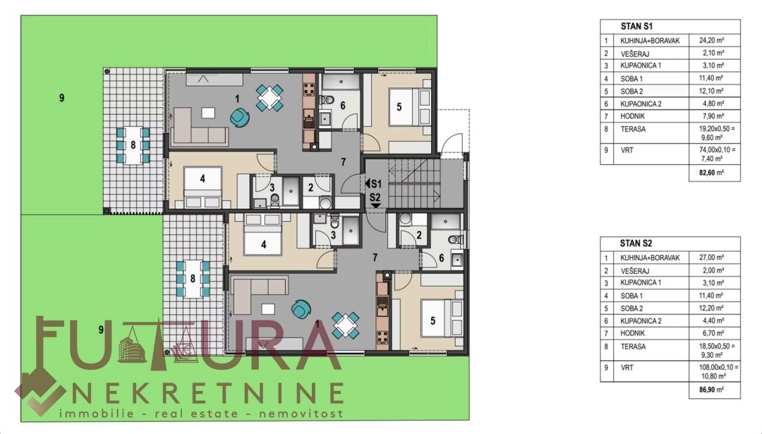 Besteht aus: zwei Schlafzimmern, Wohnzimmer + Küche + Essbereich, Flur, Hauswirtschaftsraum, zwei Badezimmern und Terrasse.
