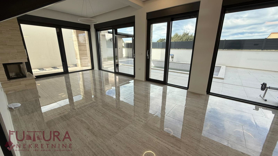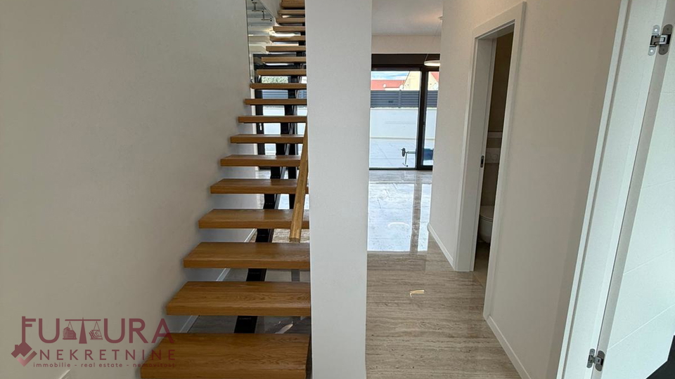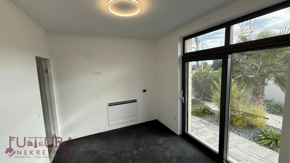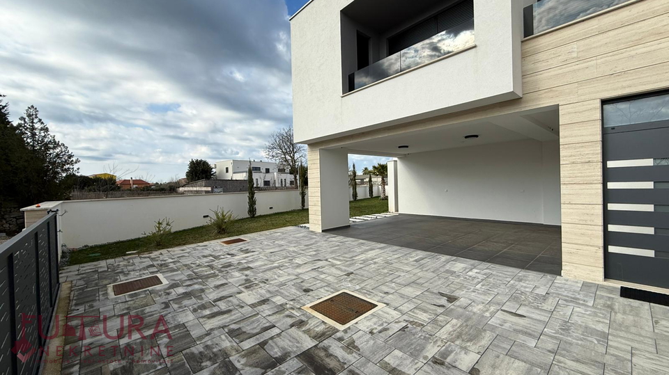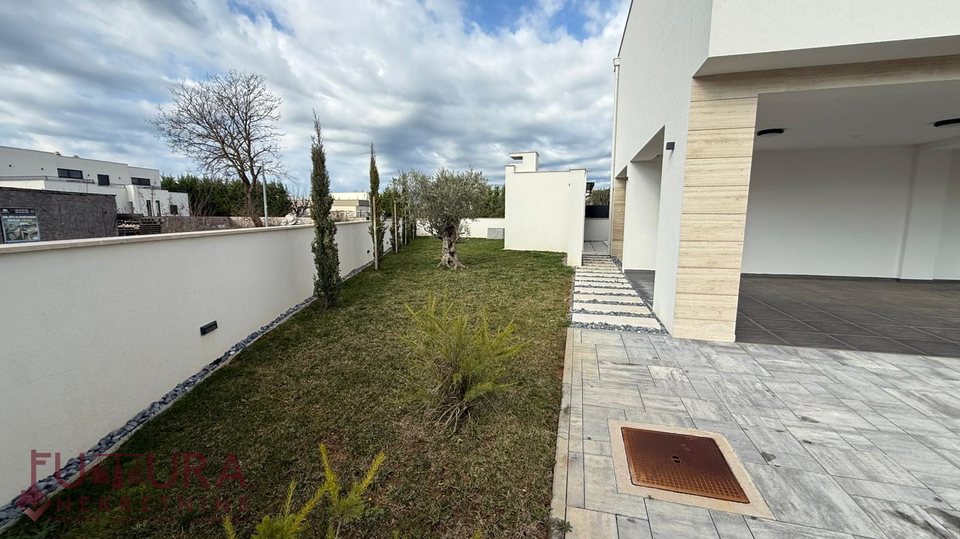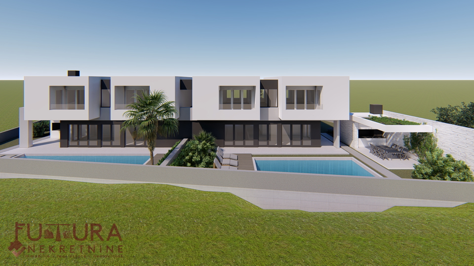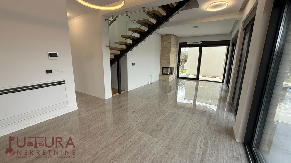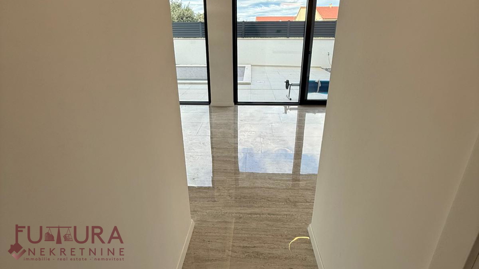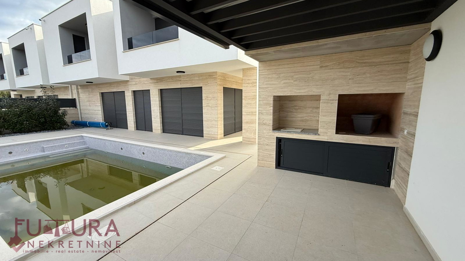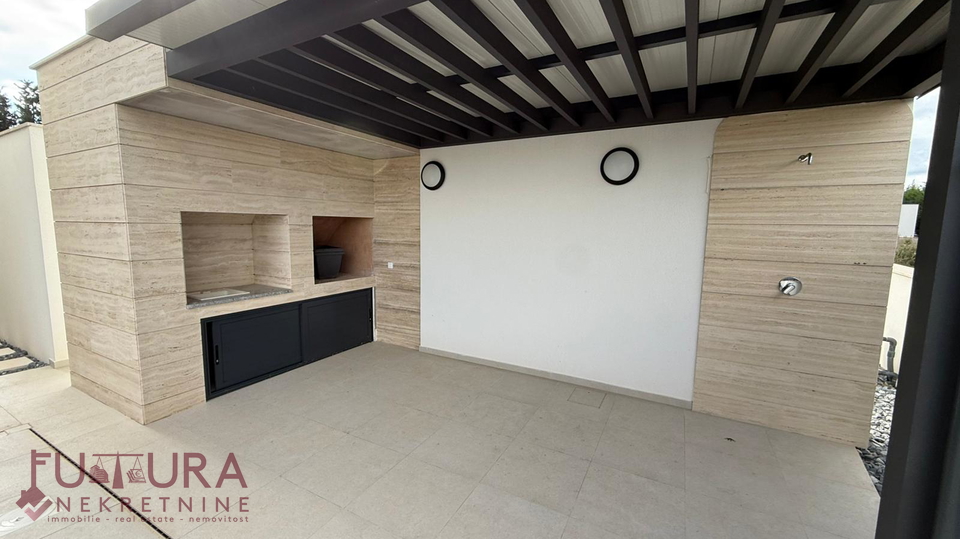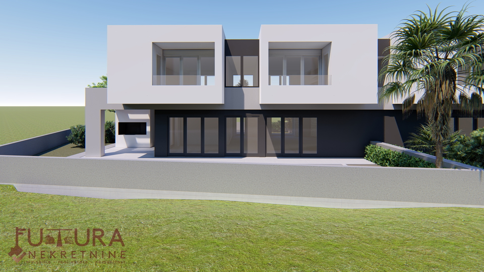Zadar - Zaton, es wird ein Doppelhaus mit 228,49 m2 Wohnfläche und 315 m2 Grundstück verkauft, erbaut im Jahr 2025 auf einem Grundstück von 517 m2. Hochwertige Bauweise mit Ziegel-Thermoblock, 15 cm dicke Styropor-Fassade, Aluminiumfenster mit elektrischen Rollläden, dreifach verglast und mit Insektenschutzgittern, einbruchhemmende Eingangstür, Böden aus Parkett und Fliesen, Heizung und Kühlung mittels Wärmepumpe, im gesamten Haus Fußbodenheizung über Wärmepumpe, das Haus verfügt über einen Schornstein und Kamin usw.