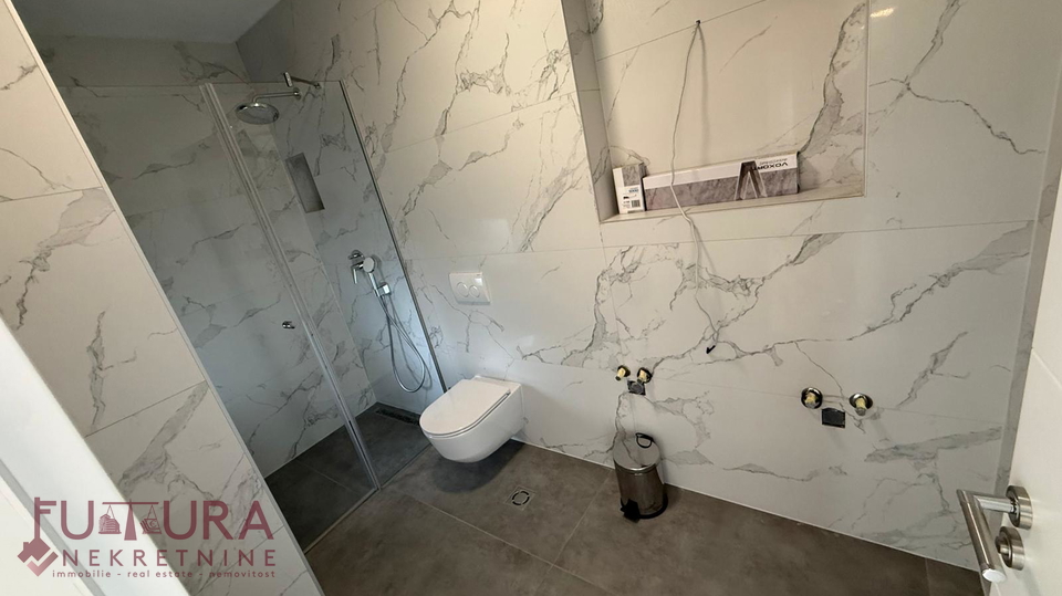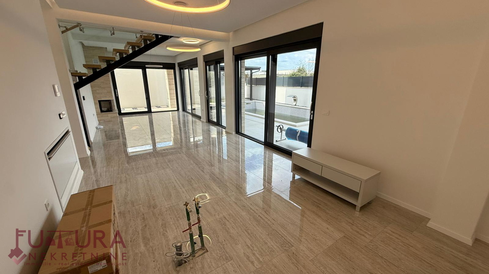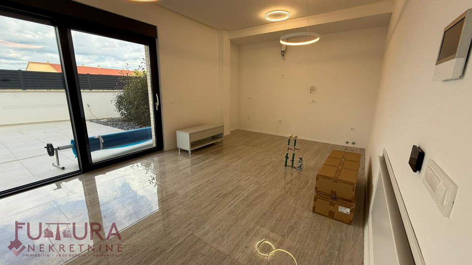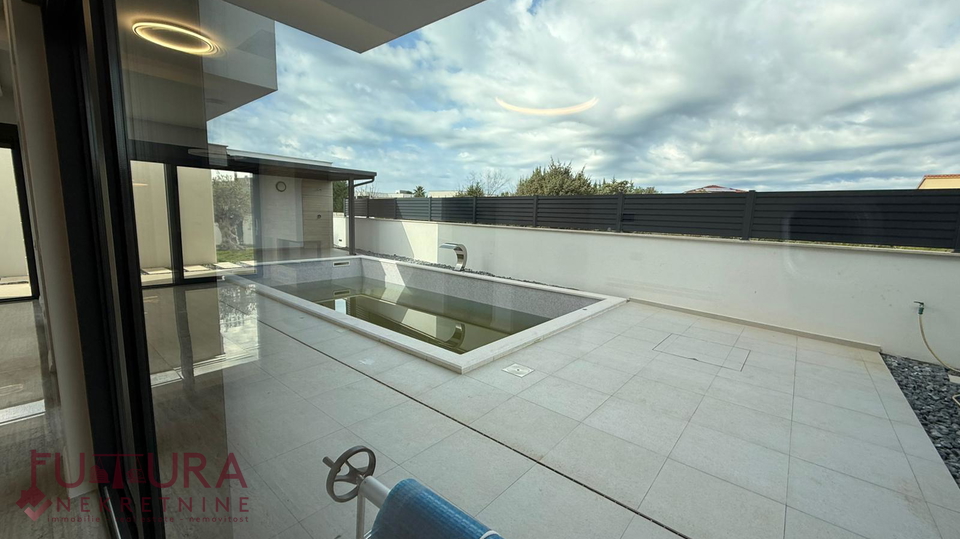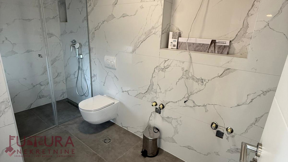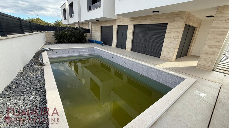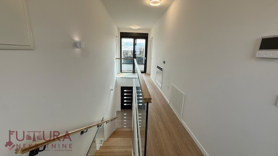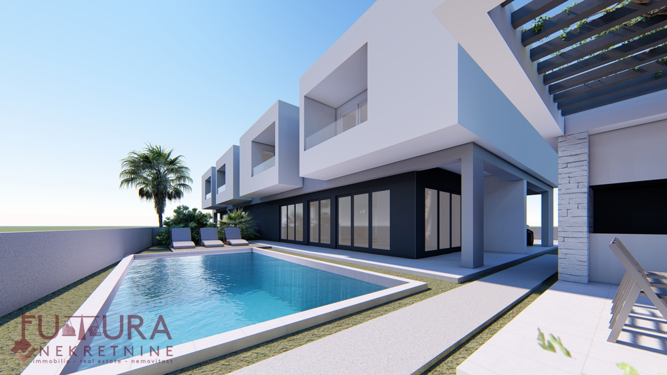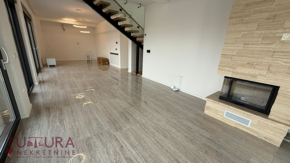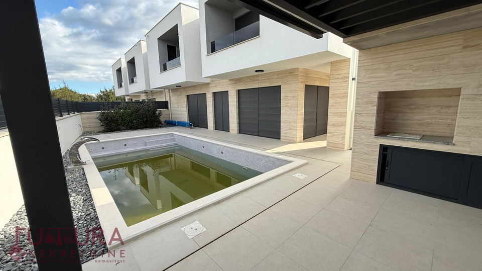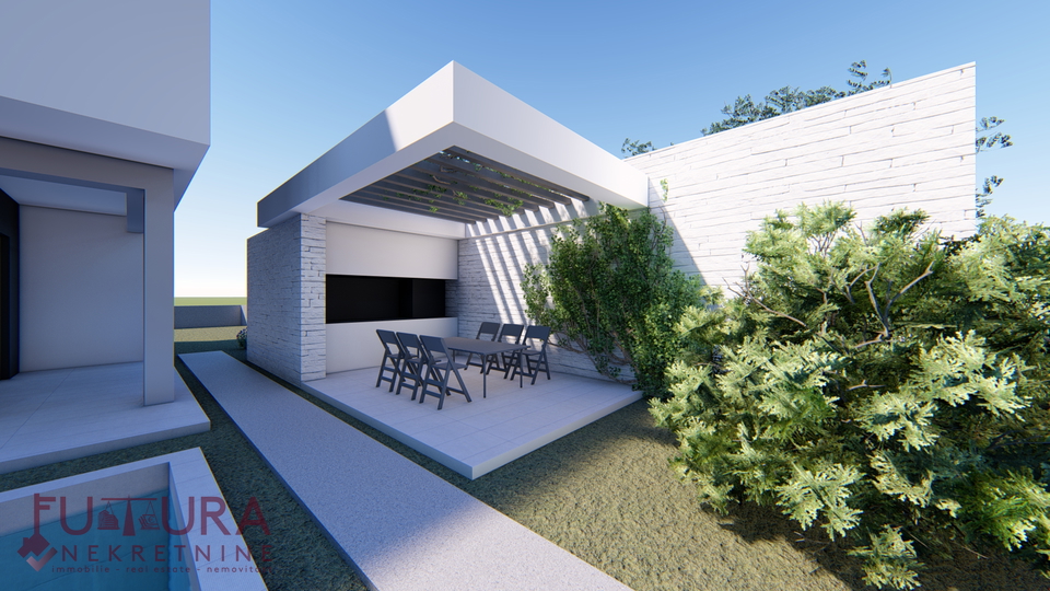 Zadar - Zaton, es wird ein Doppelhaus mit 228,49 m2 Wohnfläche und 315 m2 Grundstück verkauft, erbaut im Jahr 2025 auf einem Grundstück von 517 m2. Hochwertige Bauweise mit Ziegel-Thermoblock, 15 cm dicke Styropor-Fassade, Aluminiumfenster mit elektrischen Rollläden, dreifach verglast und mit Insektenschutzgittern, einbruchhemmende Eingangstür, Böden aus Parkett und Fliesen, Heizung und Kühlung mittels Wärmepumpe, im gesamten Haus Fußbodenheizung über Wärmepumpe, das Haus verfügt über einen Schornstein und Kamin usw.