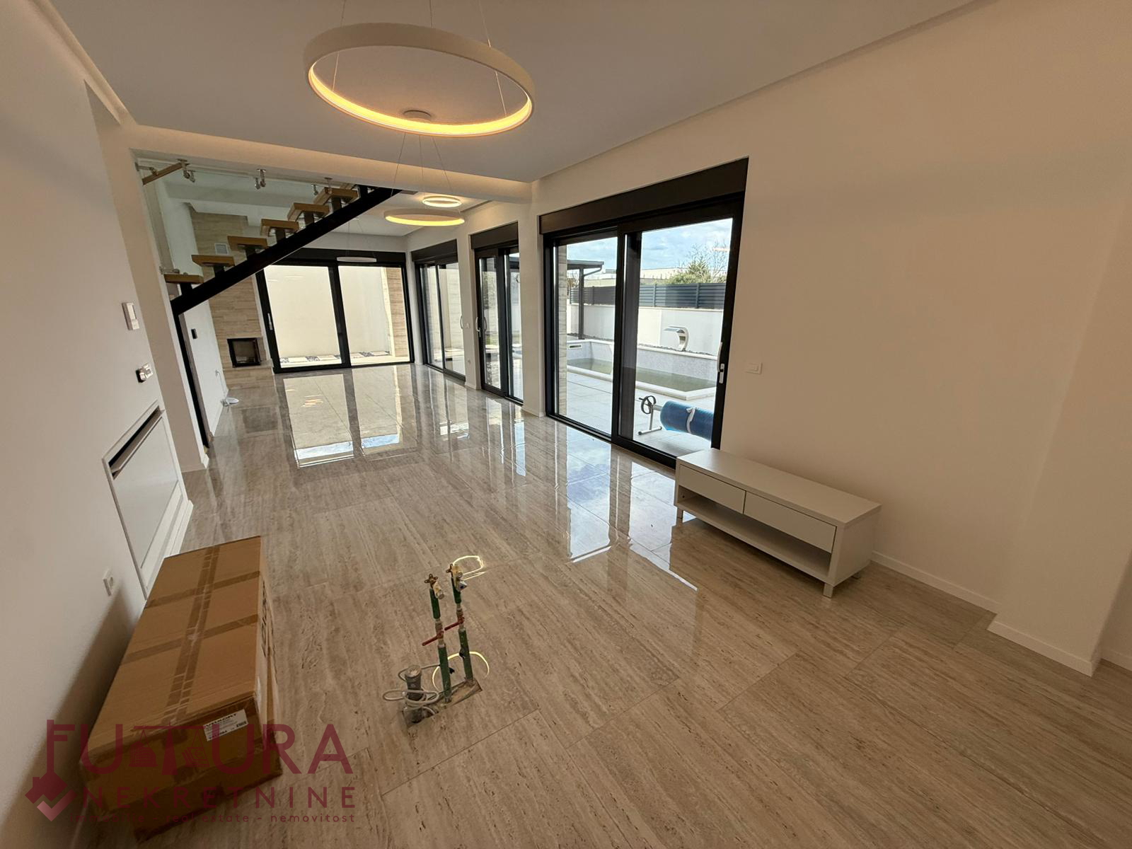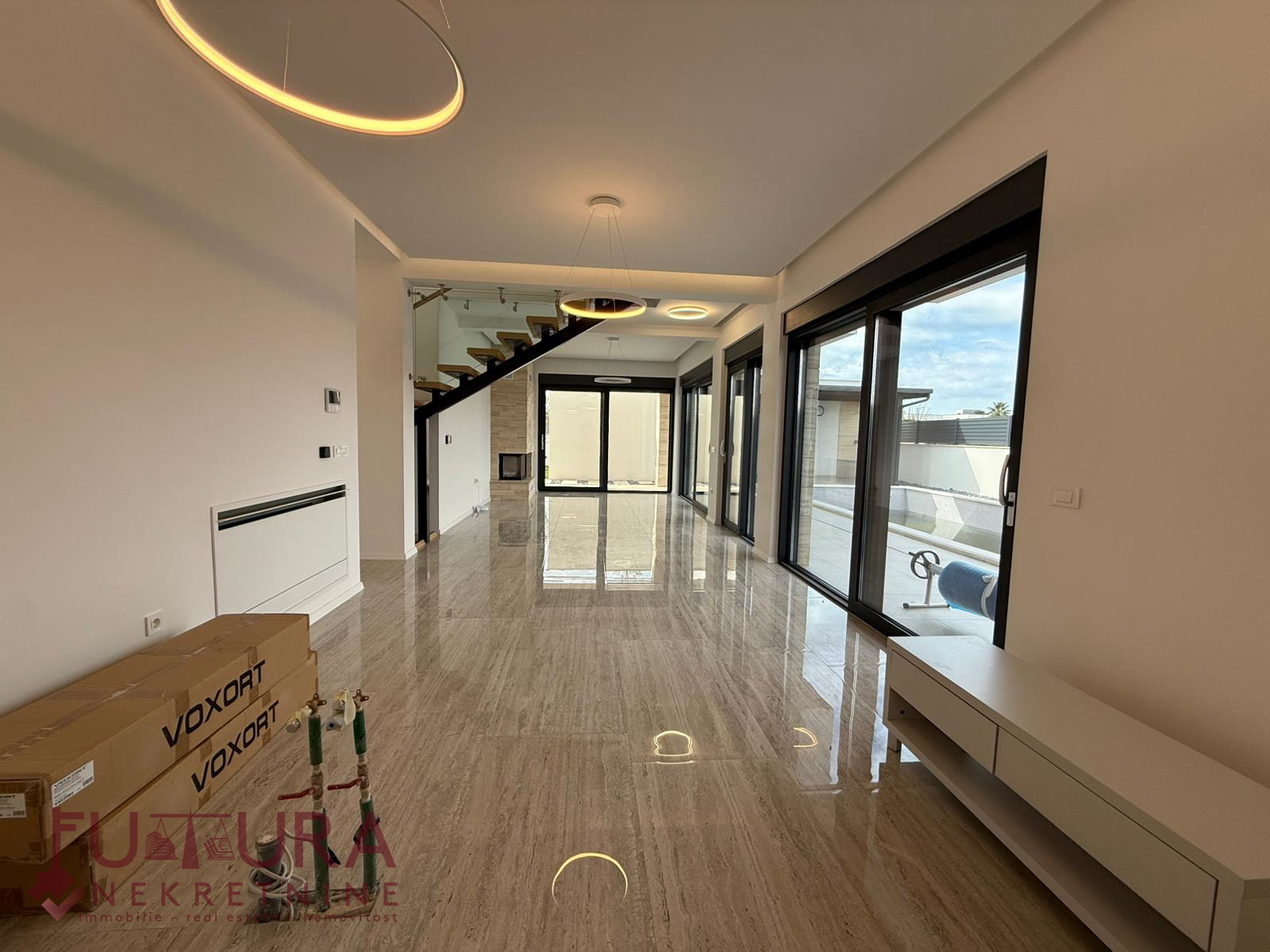 Erdgeschoss: Wohnzimmer + Küche + Esszimmer, Flur, Fitnessraum, Sauna, Heizraum, WC, Badezimmer und Terrasse.