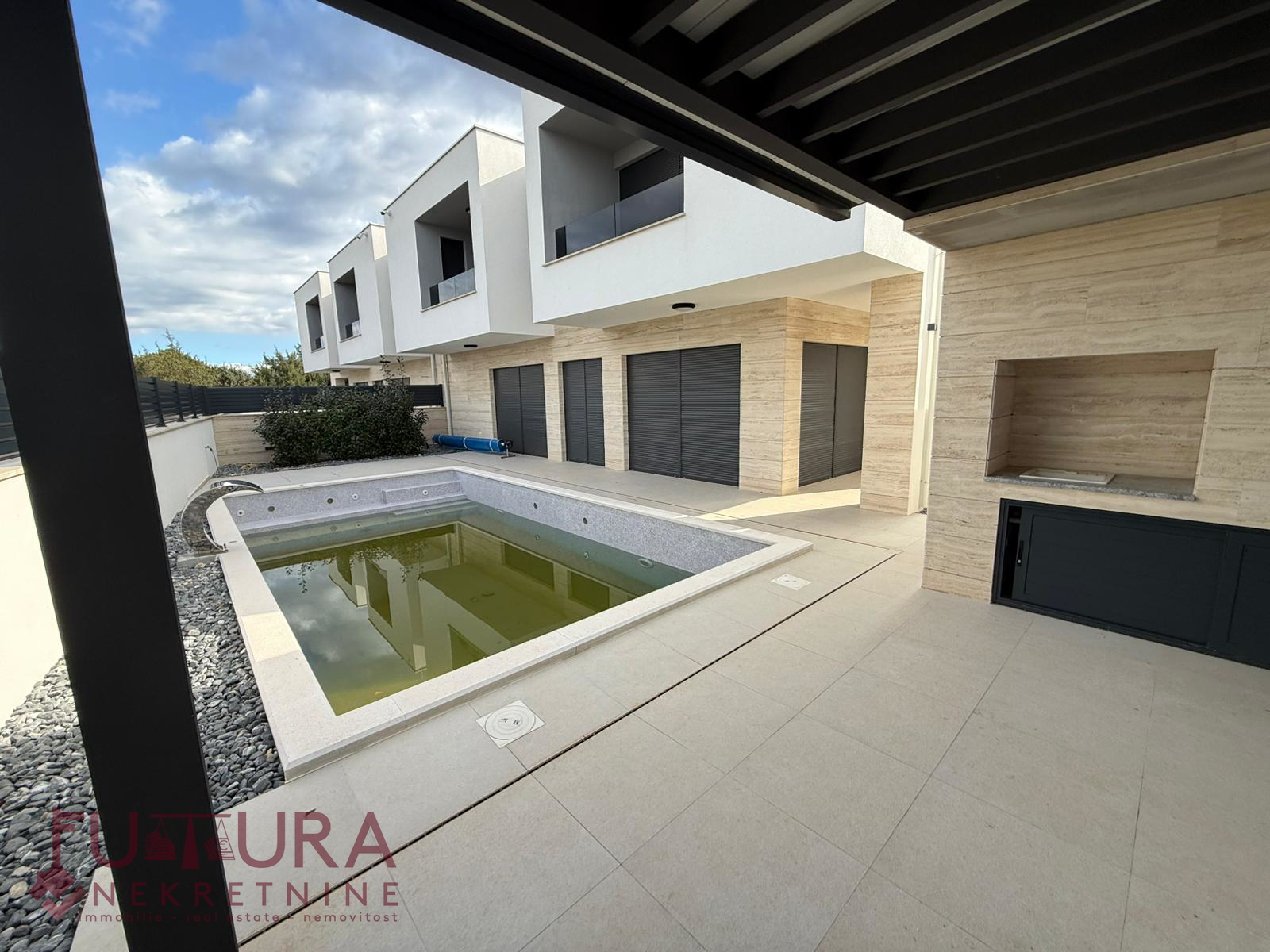 Verfügt über zwei überdachte Parkplätze, einen 32 m2 großen Pool und eine Pergola mit Sommerküche.
