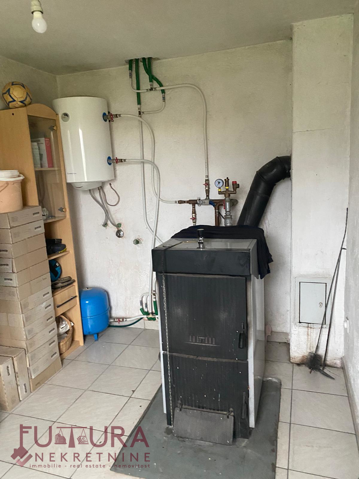 It has five parking spaces, a garage, a woodshed, a boiler room, a summer kitchen, and a chimney.