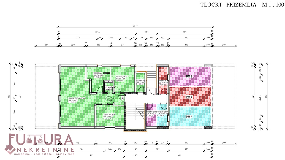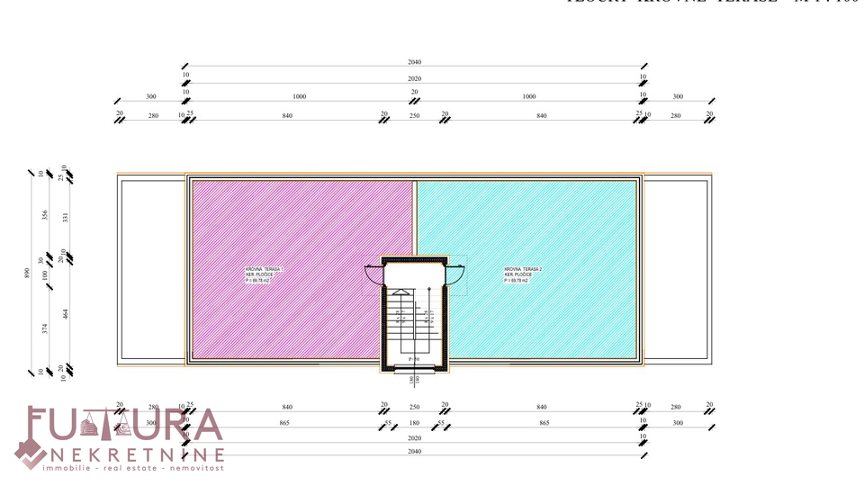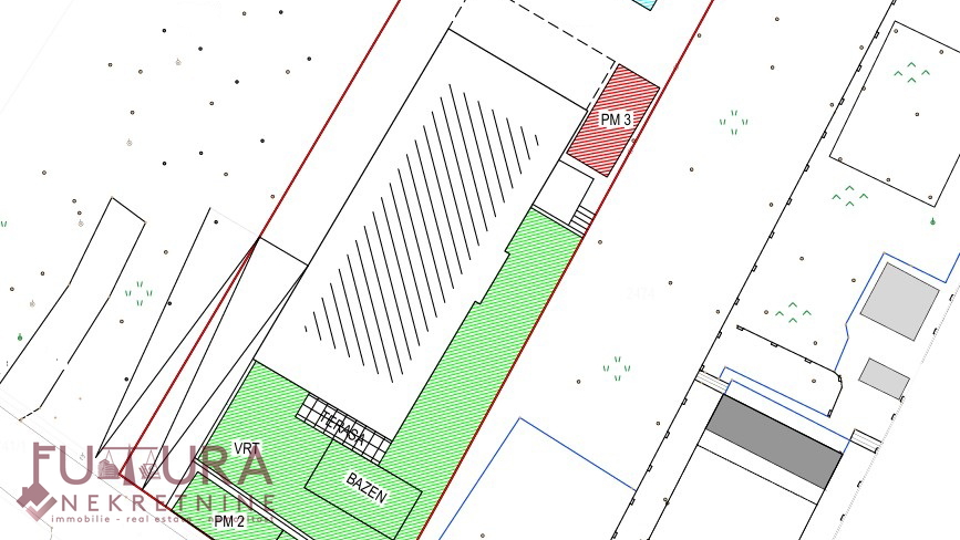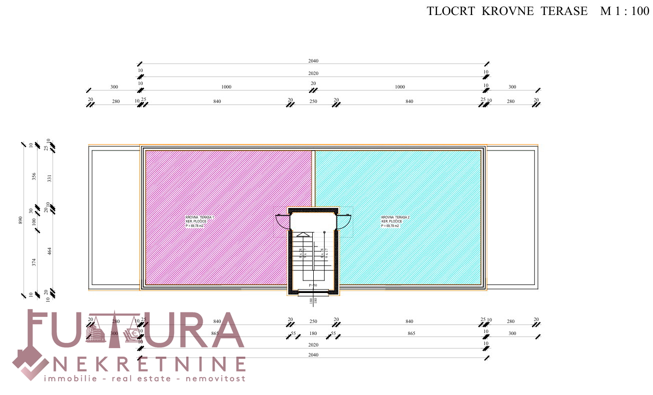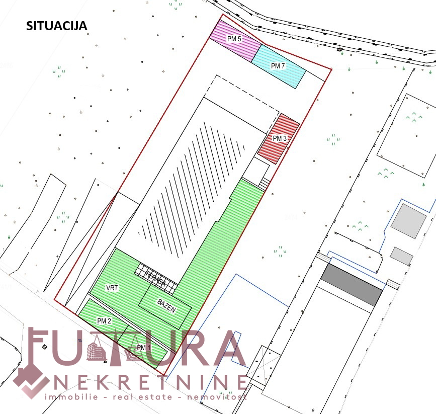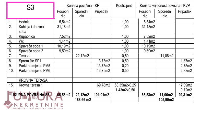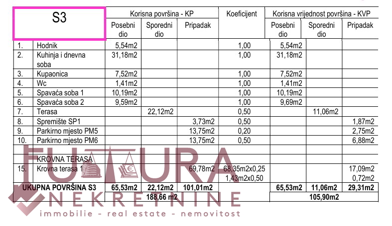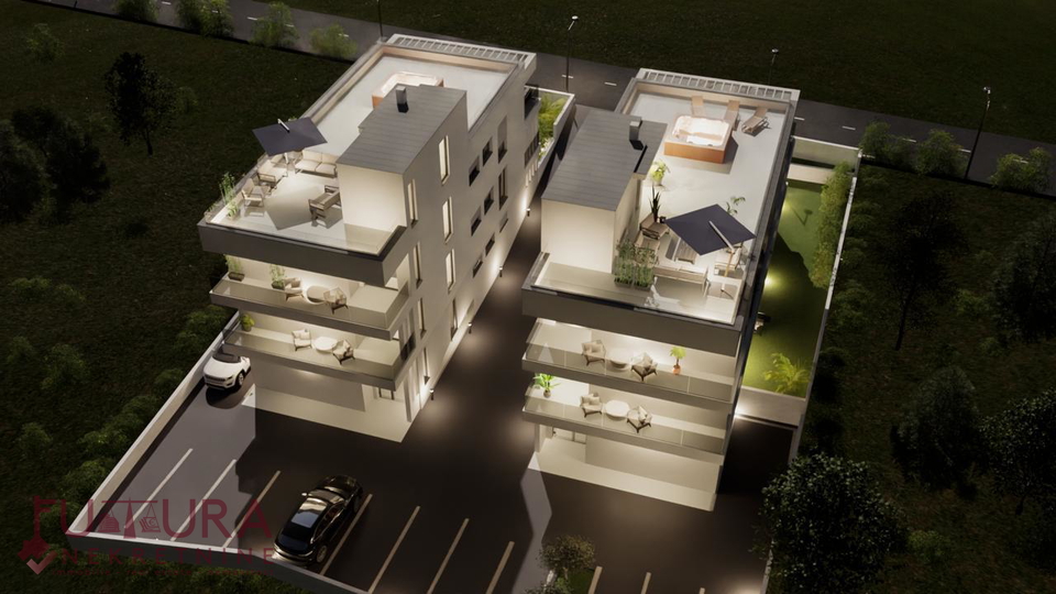 Posjeduje dva parkirna mjesta (jedno natkriveno) priprema za auto punjač, krovnu terasu od 69,78 m2 (tuš na krovnoj terasi i priprema za kuhinju) i spremište od 3,73 m2.