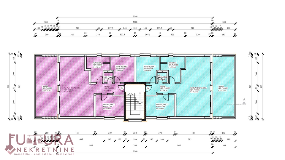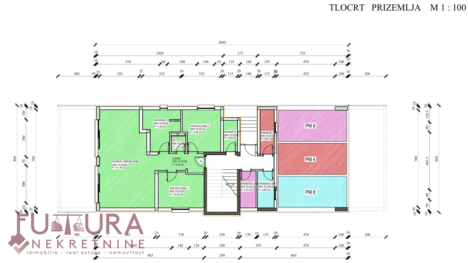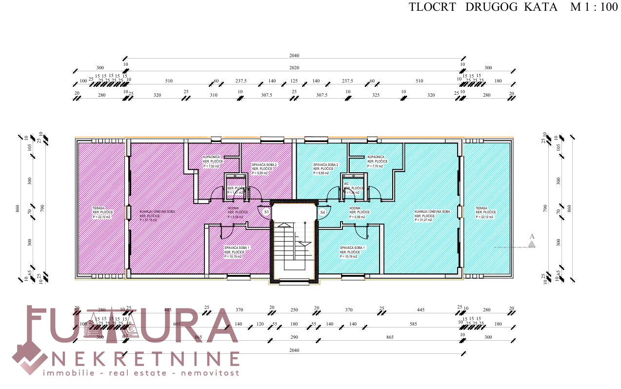 Sastoji se od: dvije spavaće sobe, dnevnog boravka + kuhinja + blagovaona, hodnika, kupaonice i terase.