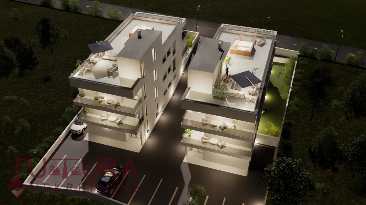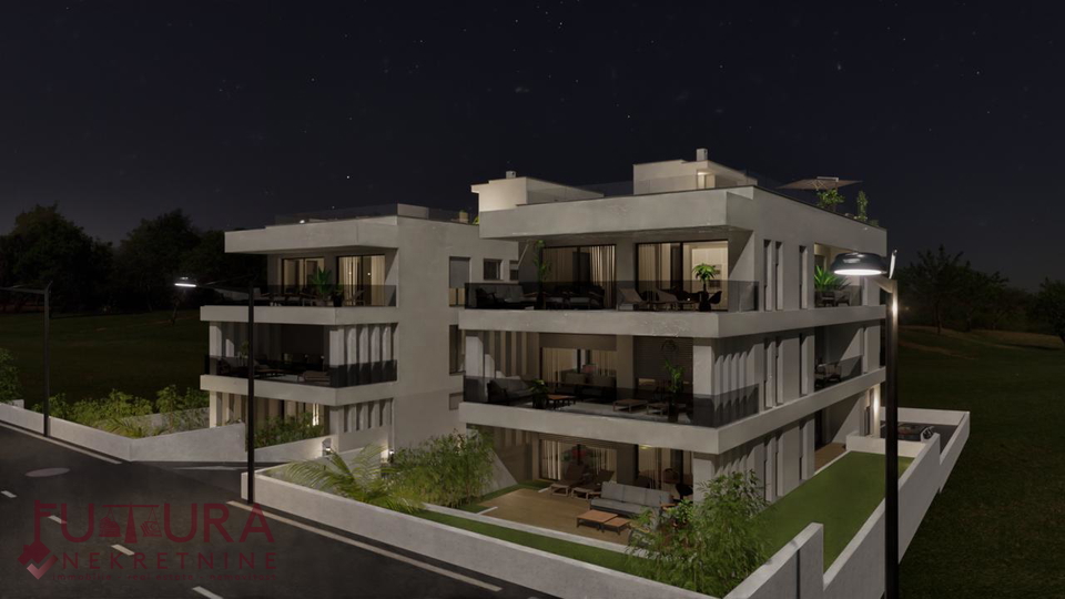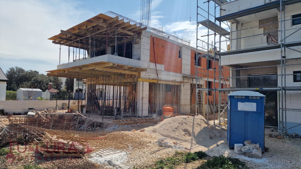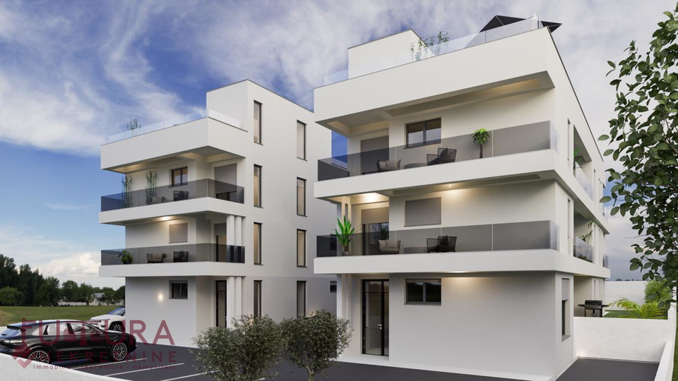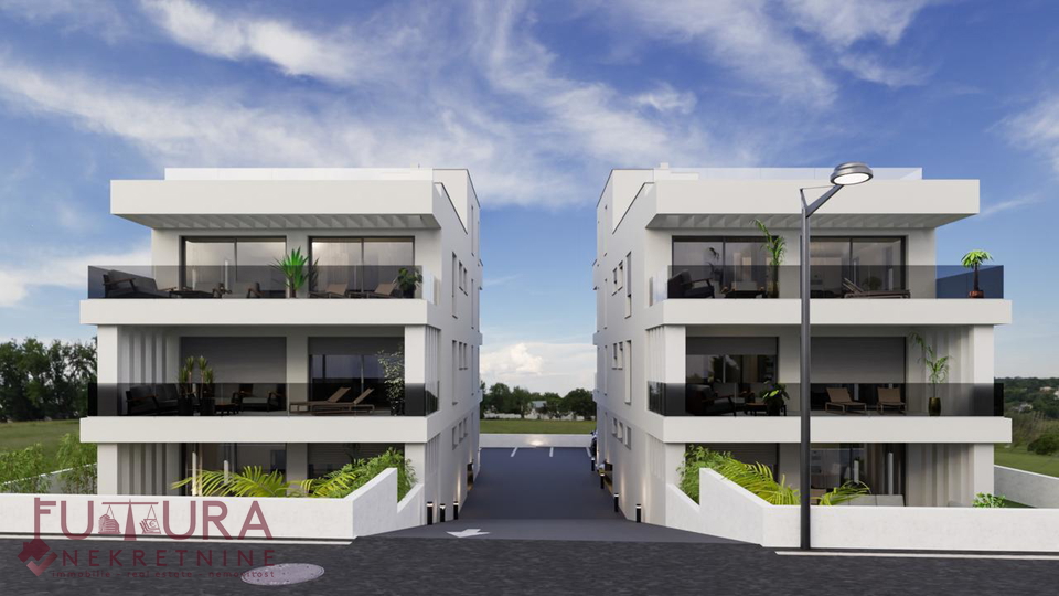 Zadar - Petrčane (Punta Radman), prodaje se dvosobni apartman od 105,90 m2 na drugom katu stambenog objekta u izgradnji, kvalitetna gradnja, podno grijanje u cijelom apartmanu. Planirano useljenje 06.2027. godine.