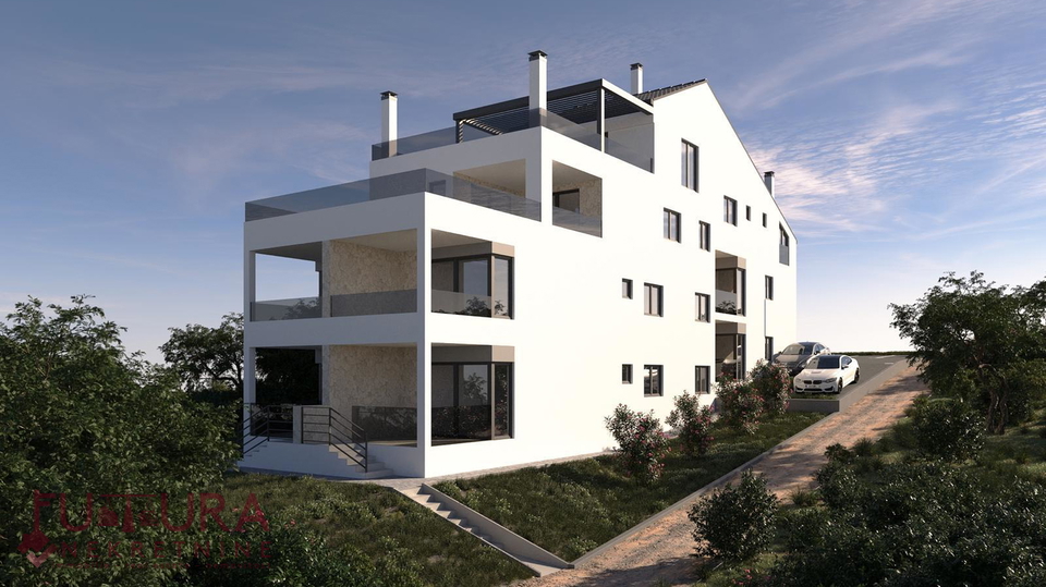 Pag - Mandre, prodaje se trosobni apartman od 83,90 m2 u potkrovlju stambenog objekta sa ukupno osam apartmana, u izgradnji, planirano useljenje 07/2026 godine. Kvalitetna gradnja, podno grijanje u svakoj sobi, električne rolete, keramičke pločice u cijelom stanu, itd...