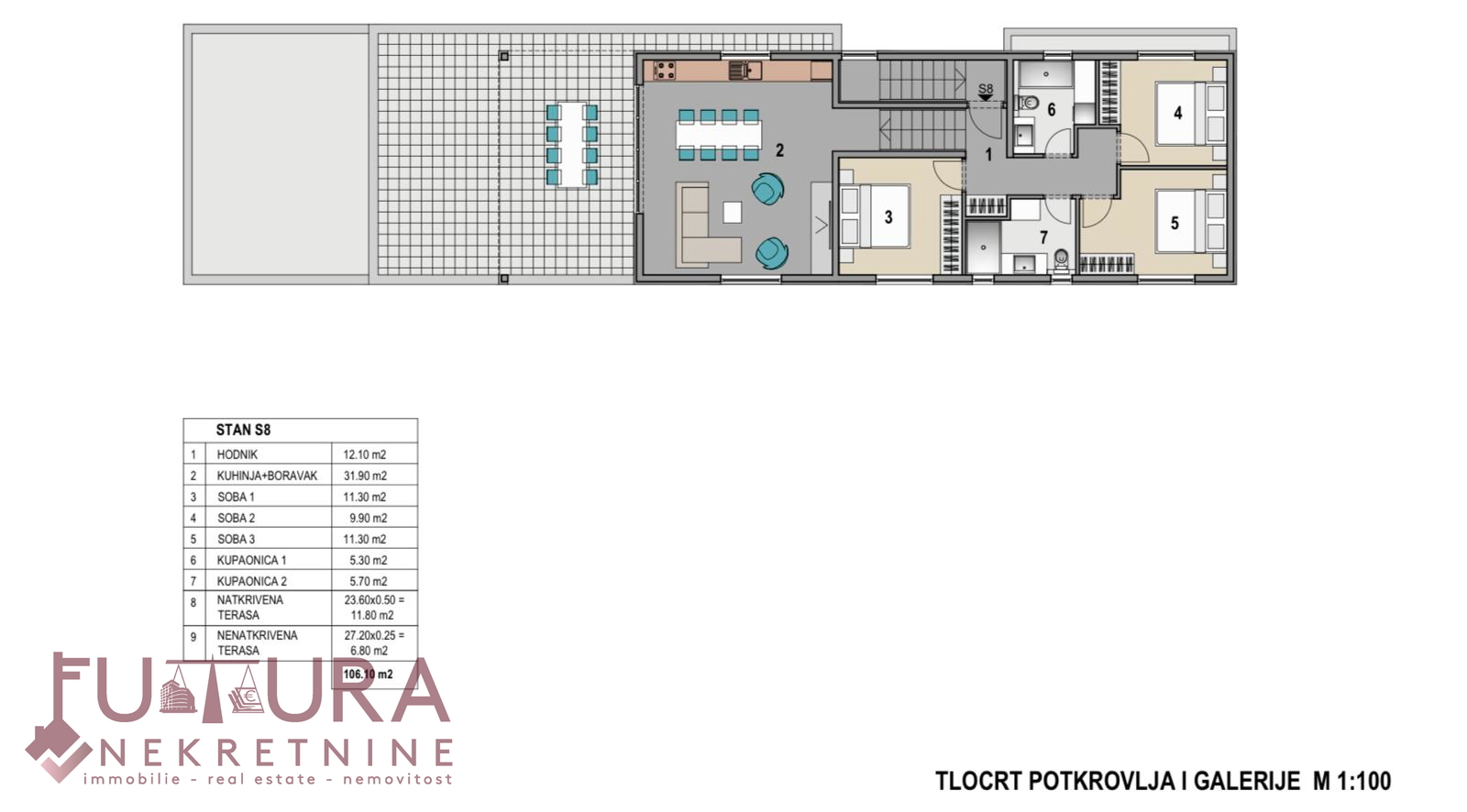 Sastoji se od: tri spavaće sobe, dnevni boravak + kuhinja + blagovaona, hodnika, dvije kupaonice i terase.