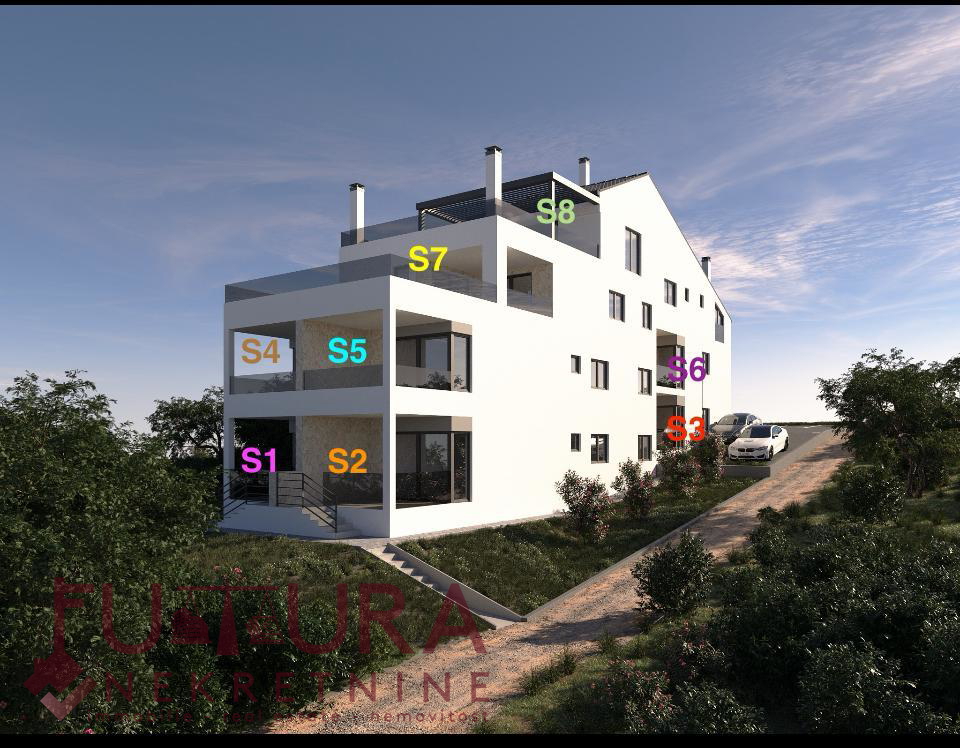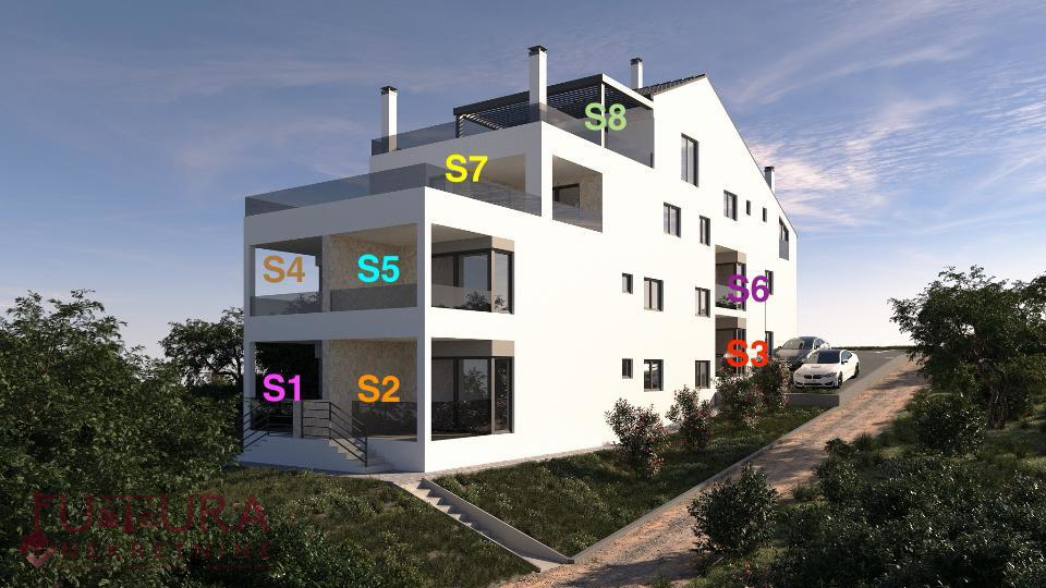 Pag - Mandre, prodaje se trosobni apartman od 106,10 m2 u potkrovlju stambenog objekta sa ukupno osam apartmana, u izgradnji, planirano useljenje 07/2026 godine. Kvalitetna gradnja, podno grijanje u svakoj sobi, električne rolete, keramičke pločice u cijelom stanu, itd...