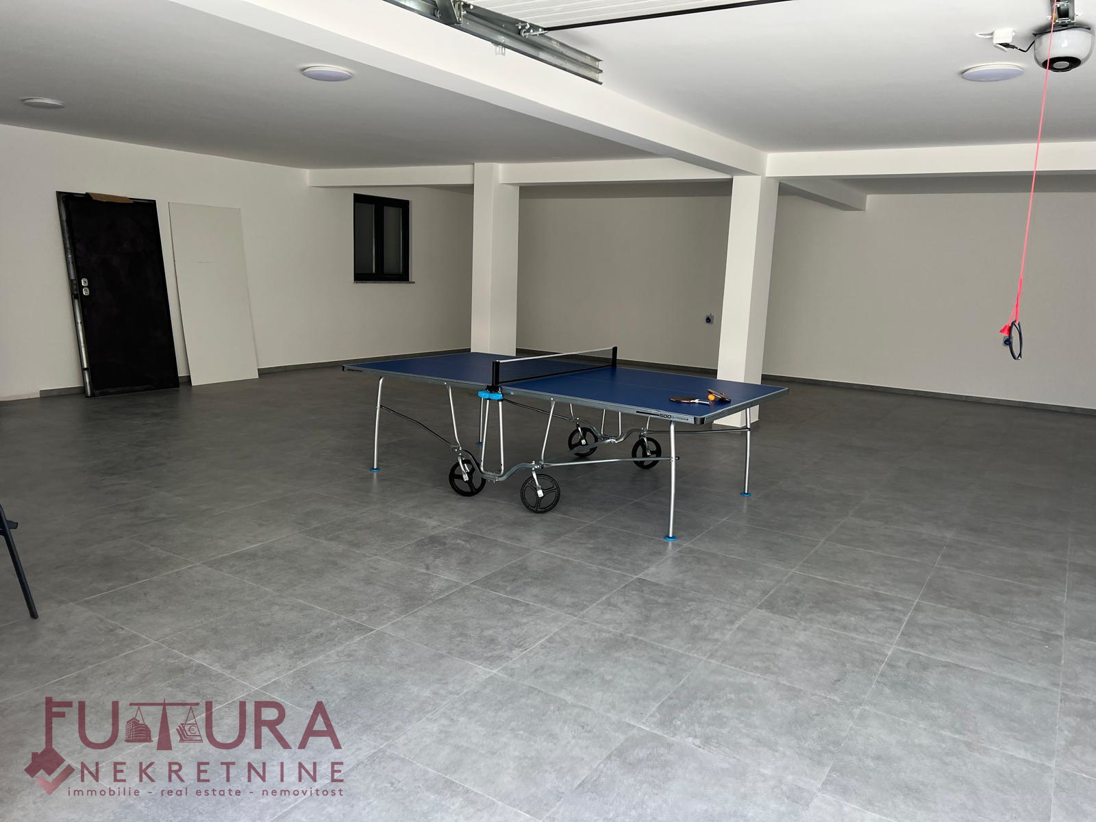 Имеется парковочное место с розеткой для зарядки электромобиля (каждое парковочное место подключено к счётчику электроэнергии соответствующей квартиры), гараж площадью 13,75 м2, бассейн 7м x 3м и сад площадью 44 м2.