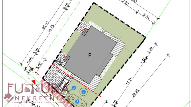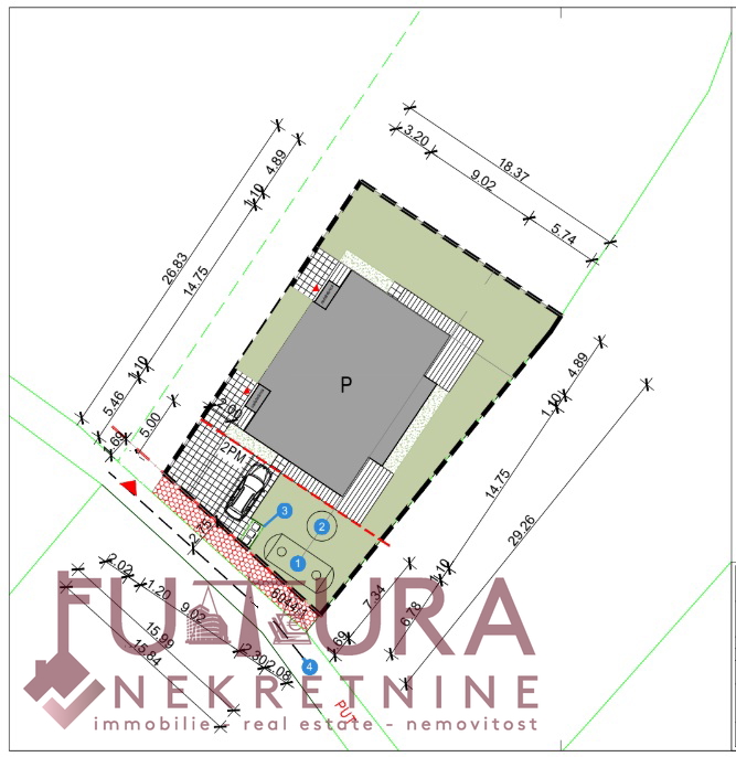 Участок правильной формы размером примерно 24 м x 20 м, подъездная дорога зарегистрирована, электричество рядом, имеется разрешение на строительство двойного дома для отдыха.
