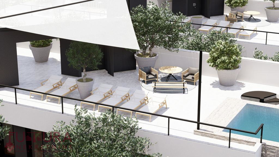 Состоит из: трех спален, гостиной + кухни + столовой, коридора, трех ванных комнат и террасы.